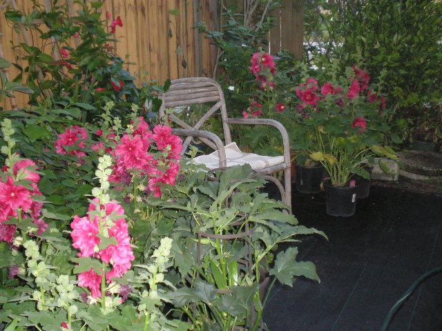 Annie's secret garden hideaway...she stashed some of the Hollyhocks during the week to give great splash of color to this calm spot for hanging out.