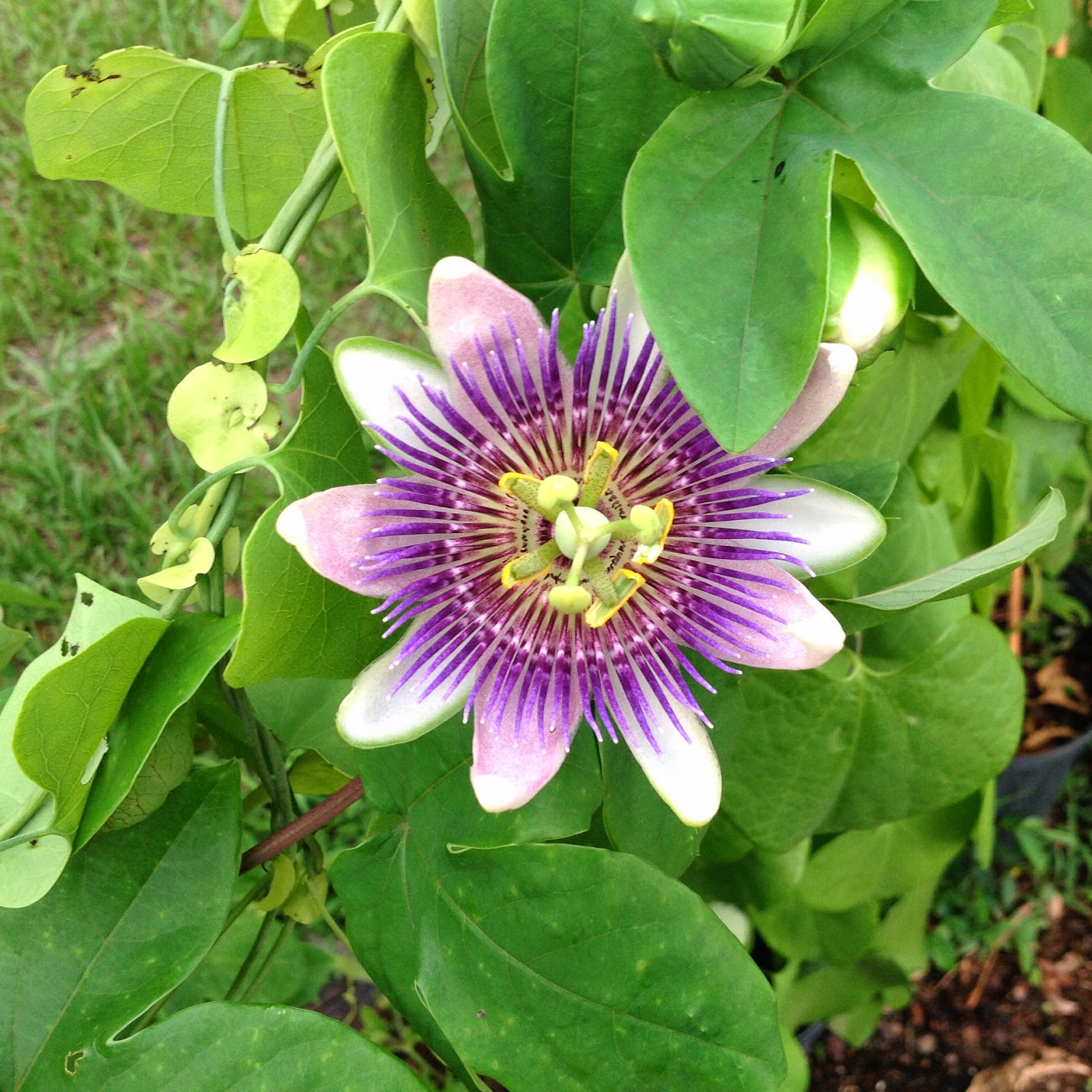 Lavender lady passion vine is blooming like crazy and the butterflies and caterpillars are going nuts for it, as usual.